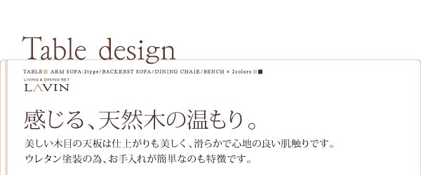 天然木のテーブルは、ウレタン塗装をしているので、お手入れが簡単!天板の木目は美しく滑らかな手触り。