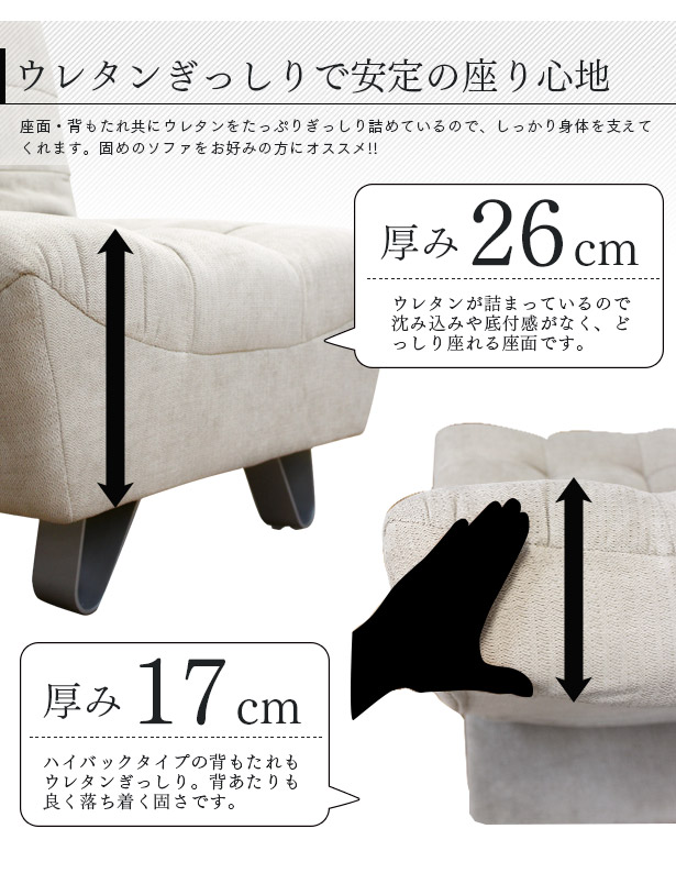 座面や背もたれは、ウレタンをギッシリ贅沢に使用しているので、ボリューム感のある優しい座り心地。