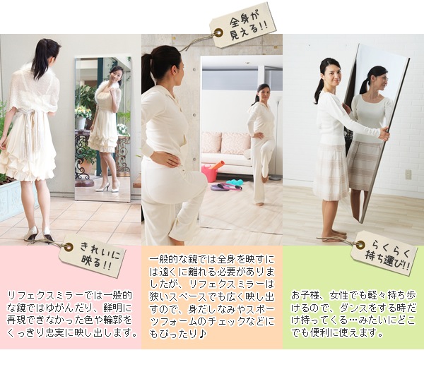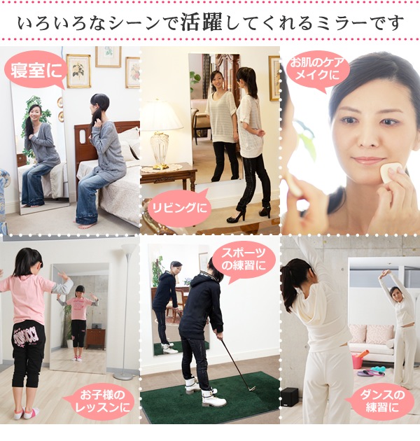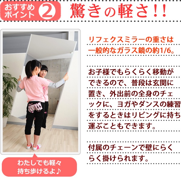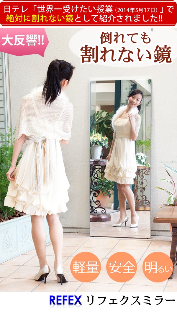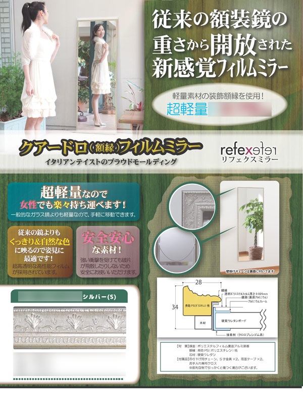 イタリアン デザイン飾縁の姿見。業務用で長年使用されているプロ仕様のミラーです。なんと、衝撃を受けたり、落下したり、倒れても割れない鏡!そして、驚きの軽さ!女性や高齢の方でもらくらく。立て掛けたり、市販のフックで簡単に壁に吊下げることも。その秘密は、硝子ではなくフィルムだからです。しかも、高透明なフィルムを使用しているので反射率が83%と高く、肌の色が自然で鮮明に映し出します。また、厚みのあるガラスは、その厚みで映像がダブってしまいますが、極薄のフィルム(0.025mm!)を採用しているのでゴーストが無く、くっきり。部屋から部屋へ移動も手軽なので、様々なインテリアと合わせてみてください。本商品は、幅84.8cmのタイプです。幅64.8cm、幅44.8cmのタイプも選べます。