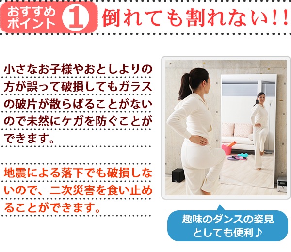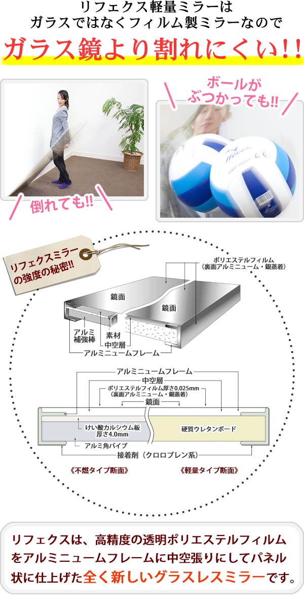 なんと、衝撃を受けたり、落下したり、倒れても割れない鏡!