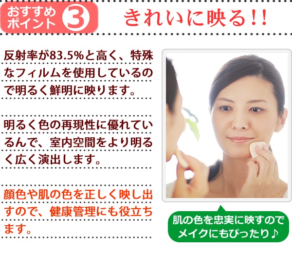 その秘密は、硝子ではなくフィルムだからです。しかも、高透明なフィルムを使用しているので反射率が83%と高く、肌の色が自然で鮮明に映し出します。