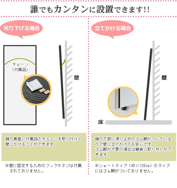 ☆内容 ミラー ☆サイズ 外形:約W84.8cm*H154.8cm×D3.4cm ☆重量:4.55kg ☆カラー:(四方飾縁)シルバー ☆製品仕様 表面(鏡面):ポリエステルフィルム 飾縁:発泡ポリスチレン:アルミニウム(巾2.8cmシルバー) 芯材:硬質ウレタンボード 滑り止め用ゴム脚:天然ゴム 生産国:日本製 ☆付属品 ・吊下げ用チェーン S菅×2 お手入れクロス 両面テープ(振れ止め用)×2 取扱説明書