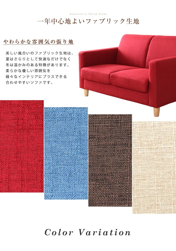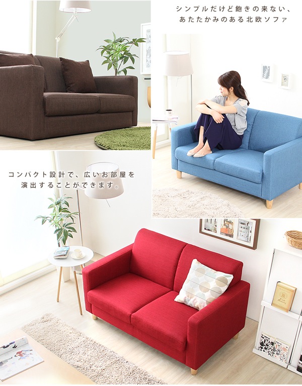 コンパクトなサイズの北欧風ソファなので、お部屋を広く演出できます。シンプルだけど飽きのこない、あたたかみのあるデザインです。天然木の脚は取り外し可能。上方の空間が広がるので、お部屋を広く感じることが出来ます。座面や背もたれは、ウレタンを贅沢に使用しているので、弾力感があり優しい座り心地。ファブリック生地は、やわらかい雰囲気の美しい風合いで、夏はさらりと快適に、冬は温かみを感じることのできる、一年を通して心地よく、様々なインテリアに合わせやすい逸品。カラーはブラウン、レッド、ブルー、ベージュの4色展開!