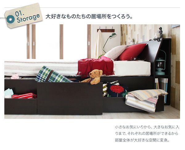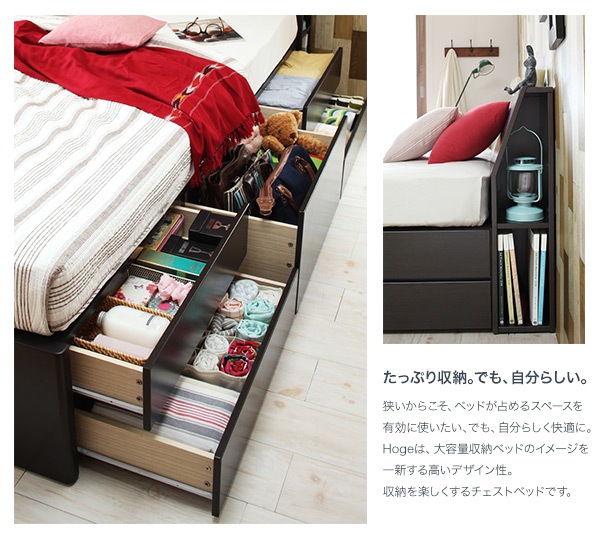 高いデザイン性ながら、大容量収納が可能。ベッドが占めるスペースを少しでも有効活用したい方に最適。お部屋が心地良い空間になります。