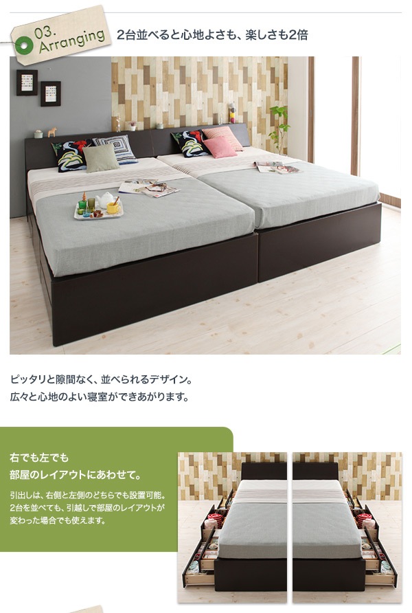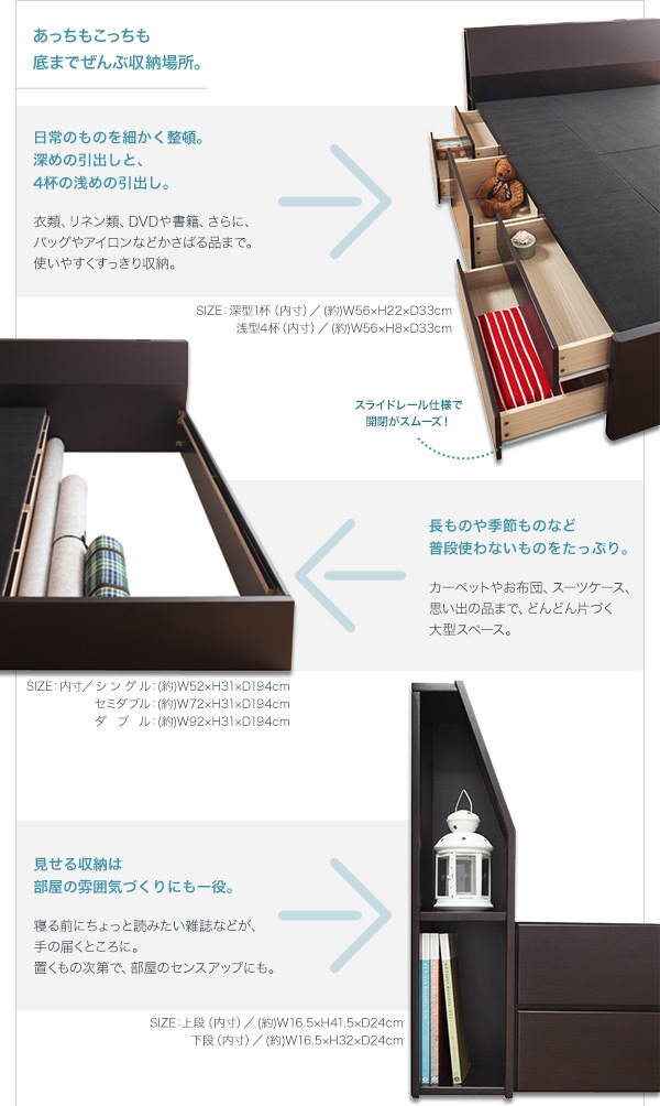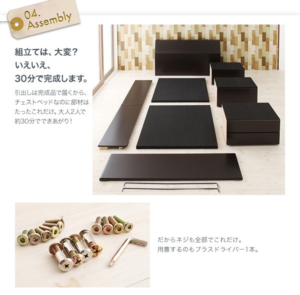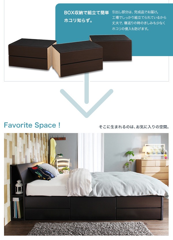 引出し部分は、工場でしっかり組立てられた完成品でお届けします。丈夫で、寝返りの時のきしみも少なく、ホコリの侵入も防げます。