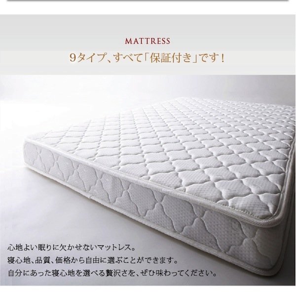 また、質の良い深い睡眠には、自分に合ったマットレスが必要不可欠。寝心地、品質、価格から自由に選べるように、贅沢に9タイプご用意。保証付きです。