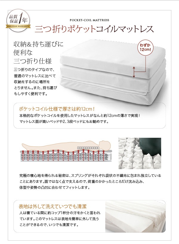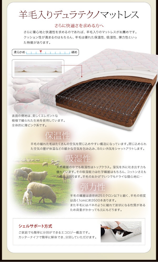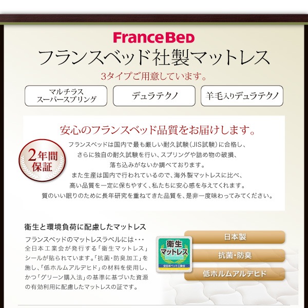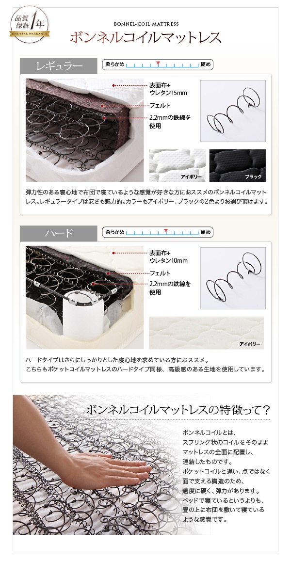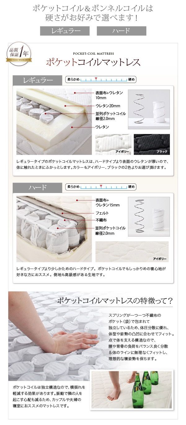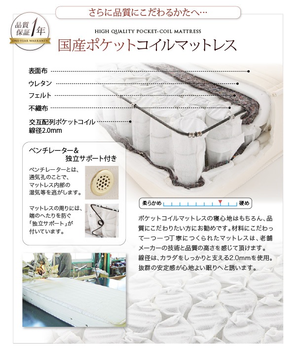 本商品は、国産ポケットコイルマットレス付きです。寝心地や品質にこだわりのある方にオススメ。老舗メーカーの技術と品質で、一つ一つ丁寧につくられています。