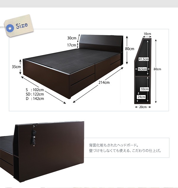 ☆内容 (セミダブル)ベッドフレーム、(セミダブル)国産ポケットコイルマットレス ●ベッドフレーム ☆サイズ 外形:約W122×L214×H80cm 床板までの高さ:35cm 引出内寸 浅型:横56×奥行33×深さ8cm 深型:横56×奥行33×深さ22cm 長尺:横72×奥行194×深さ31cm ☆材質 プリント化粧板(ウレタン塗装) 1500W2口コンセント ☆生産国:中国 ☆耐荷重:約120kg ☆商品重量:(約)95.63kg ☆梱包サイズ・梱包重量 (約)(1)130×86×25cm:27kg(2)102×38×9cm:10kg (3)126×38×5cm:6kg(4)98×79×11cm:12kg (5)69×48×39cm:16kg(6)(7)69×48×39cm:17kg ※お客様組立品(プラスドライバーをご用意ください。) ※ベッドのフレームはスプリングマットレス使用時の基準で強度計算されております。 そのため、床板に直接布団などを敷いてご利用になりますと破損の原因となる場合があり、大変危険です。 床板の上に必ずスプリングマットレスを敷いてご利用ください。 ※製品の仕様・デザインは予告なく変更する場合がございます。予めご了承ください。 ※実際の商品の色にできるだけ近づけるよう、撮影を行っておりますが、商品の色は、ご使用のモニターによって 実際の明るさや色と多少異なって見える場合もございます。予めご了承ください。 ●国産ポケットコイルマットレス ☆サイズ 外形:約幅120×長さ195×高さ20cm ☆材質 2.0mmポケットコイルスプリング(コイル数:756)、フェルト、ウレタン、綿100%、両面多針キルティング加工 ☆カラー:アイボリー ☆生産国:日本 ☆商品重量:約37kg ☆梱包サイズ:約123×197×22cm ※1年保証付き(マットレスのみ) ※マットレスを長くご愛用頂くために1〜3ヶ月に一度、頭と足の位置を入れ替えたり、裏返しをするベッドローテーションをおすすめします。